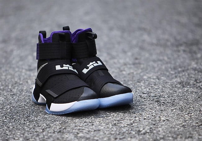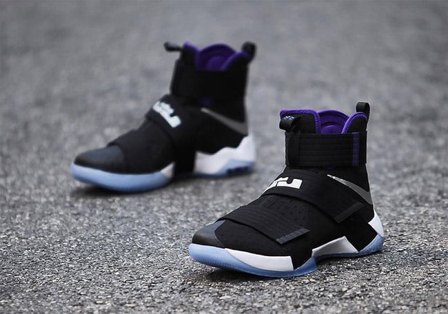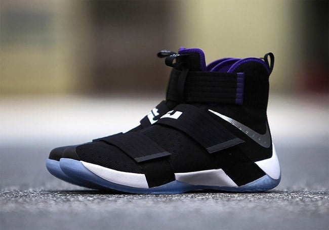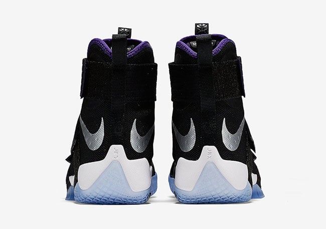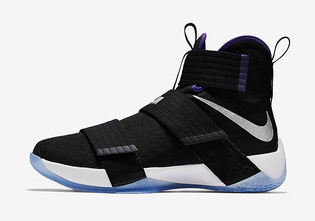 This Nike LeBron Soldier 10 doesnโt have any connections to the Sacramento Kings other then a similar color theme. As you can see, predominate Black is used through the base while Metallic Silver hits the Swoosh. Purple is then hinted on the liner and at the end of the top strap. Other details include hits of White and a translucent outsole.