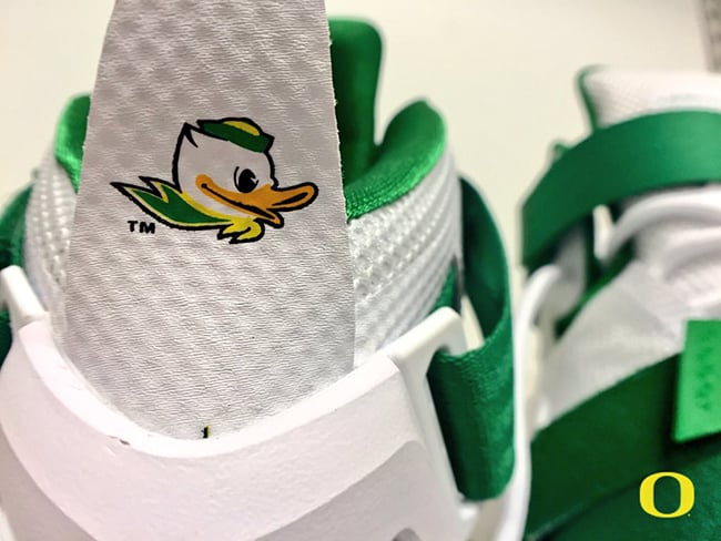 Using a predominate apple green that almost takes over the entire shoes. Additionally yellow strike is accented throughout. From these images, the only place we see any Oregon Ducks branding is a small icon placed on the heel tabs.
