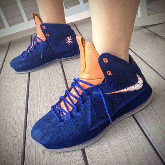 If you sneakerheads can recall, the Nike LeBron X Low released in a vibrant orange/blue color scheme to which earned them the “HWC” nickname. In using the same color palette, sneaker customizer Mache Customs has created this dope pair of “Hardwood Classic” Nike LeBron X EXT customs. In dying the suede upper blue, Mache also throws in some paint speckle about the bottom air bag and side Swoosh. With the radiant hints of orange shining extremely bright amongst the recolored shoe, one can only imagine the chaos that would have ensued had these actually been an actual release. Another look at Maches latest creation awaits you all after the jump so be sure to check it out and drop us a line in the comments section below.