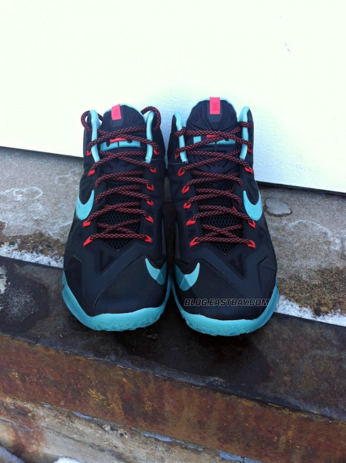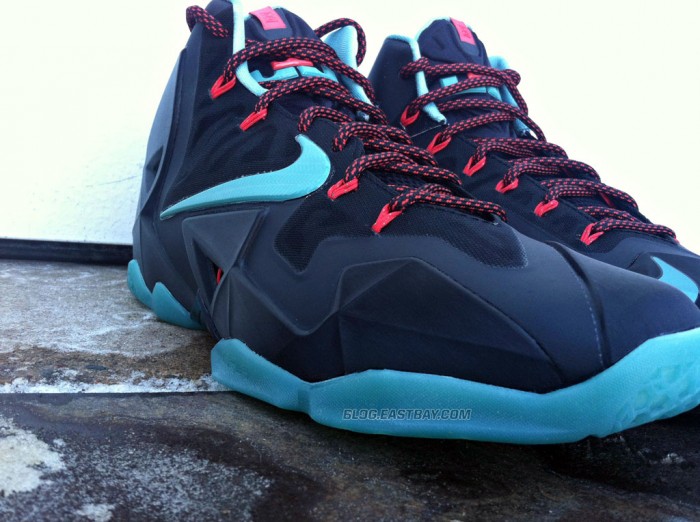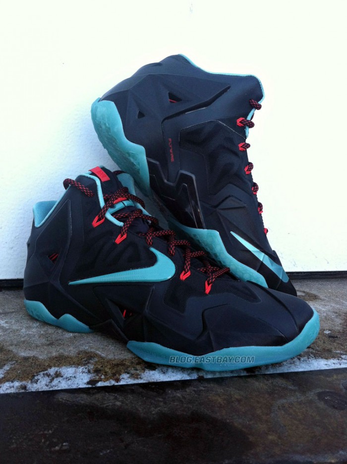 Releasing in just a few days, new images of this Nike LeBron XI (11) hone in on its unusual colorway which boasts a black base and contrasting hints of diffused jade, light crimson, and jade glaze. What has seemingly popped up out of no where, what do you make of this colorway? Is it a “Cop”, or “Pass?”