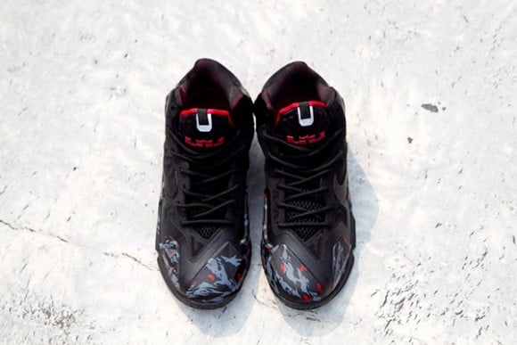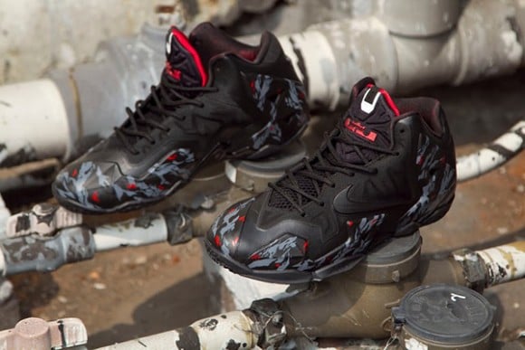 Remember Lebron James’ Miami Heat record breaking game, a couple of weeks ago against the Charlotte Bobcats? Scoring 61 points, 7 rebounds, and 5 assists, James surpassed the previous 54-point game record set by Miami Heat’s Glen Rice, in 1995. Now do you remember whenย Bruce Wayneย King James donned a black carbon fiber mask after suffering from a broken nose, against the New York Knicks? I personally thought that was awesome, but after NBA requests, James laid the mask aside for a clear one. Well sneaker artist collective Sneaker Bow has whipped up a new pair of customs to celebrate James’ latest career highlights. The Nike Lebron XI (11) “Bloody Bat King” customs by Sneaker Bow see a black and grey camo-like pattern all over the uppers, accented by red. This pair was created for the seemingly invincable King James (or Bat King), after his recent fashion choices. To further incorporate the concept of the blood, sweat, and tears that James has given to his professional career, red lines the overall dark shoes. These are a 1-of-1 custom job, available in a 7Y size over at Sneaker Bow! More pictures below!