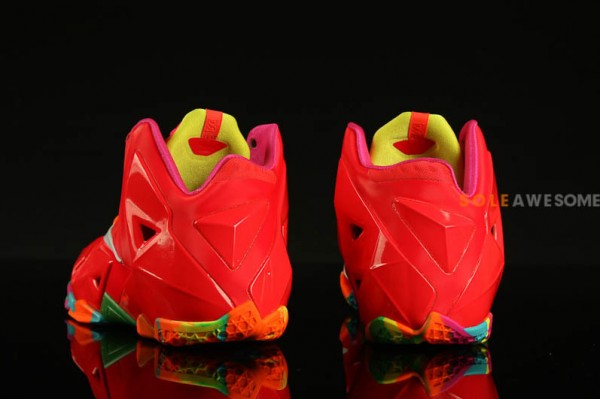As characterized by its bright red and multi palette, the Nike LeBron XI (11) GS “Fruity Pebbles” is one heck of a shoe. Just look as the uppers reflect the light, or how its outsole uses colors of the rainbow – amazing! Unfortunately for now, these kicks will only come in gradeschool sizes however we’ll surely let you know if that changes.