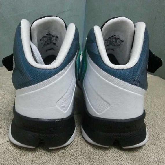 Seen for the first time, this alternative model for LeBron James sports a white based upper, teal-colored Hyperfuse overlays, volt Flywire, black panels, and more like a yellowed mesh tongue and turquoise ankle straps.