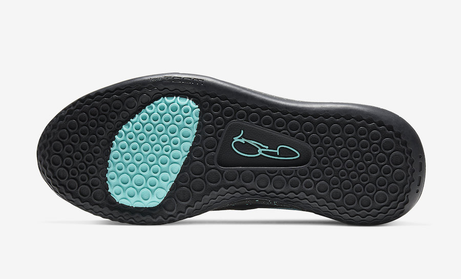 This Nike PG 3 comes dressed in a Black and Light Aqua color combination. Featuring Black across the upper, Light Aqua hits one of the eyelets, tongue pull tab and running down, speckled across the Black midsole and accents the rubber outsole which completes the look.
