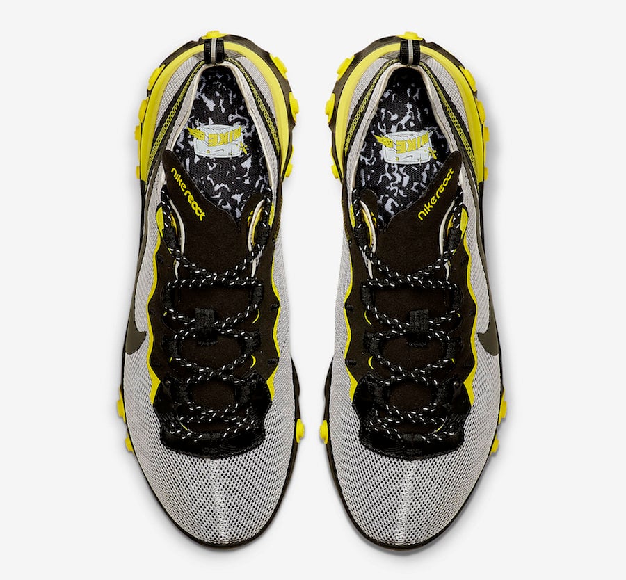 This Nike React Element 55 comes dressed in a Pure Platinum, Black and Dynamic Yellow color combination. Highlighted with Platinum on the mesh upper, both Black and Yellow is seen accented throughout. Other details includes a Black React cushioned midsole along with more Yellow detailing.