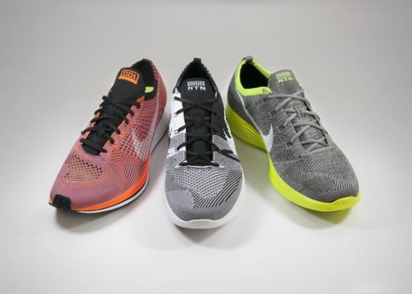 Meant to show off the new Flyknit technology before its widespread debut later this Summer, the collaboration between Nike CEO Mark Parker, fragment design founder Hiroshi Fujiwara and design legend Tinker Hatfield once again includes a Flyknit Racer alongside two pairs of the Flyknit Trainer+. This time around the Racer comes in a Total Orange colorway while the Trainer+ will see Grey/Volt and Black/White looks.
