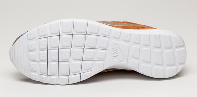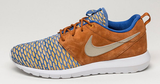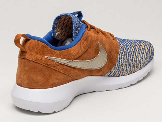 Using a mixture of materials, this Roshe NM Flyknit is dressed in game royal, metallic gold grain and tawny. Flyknit in blue covers the toe which extends through the tongue while the same shade also hits the liner. Following is brown suede that flows through the panels. Other details include a silver swoosh and a white NM midsole.