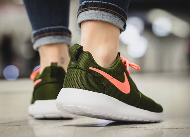 Getting more specific, this Nike Roshe One features a Legion Green, Lava Glow and White color combination. Across the uppers we have Olive Green while Lava Glow is applied to the Nike Swoosh, heel branding and laces for added pop. Completing the look, White runs across the midsole and extends across the outsole.