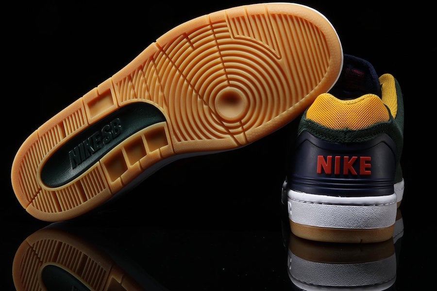 This Nike SB Air Force 2 comes dressed in a Midnight Green, Habanero Red and Blue Void color combination. Utilizing Dark Green and Blue, we have Red used on the brand as well as the Nike Swoosh on the heel. In addition we have Gold on the liner, White across the midsole and a Wheat outsole completes the look.