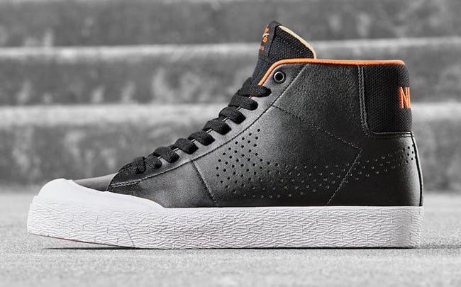 This Nike SB Blazer Mid comes dressed in a Black, Orange and White color combination. Featuring a black leather upper, orange detailing and a perforated swoosh, the Nike SB Blazer Mid XT also features a durable rubber toe capย and Zoom Air in the heel for responsive boardfeel and impact protection for hard landings.
