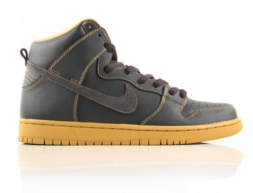 Not to be left out of the Nike SB party by the likes of the Stefan Janoski, the Dunk high rears its head again as well. Pictured here is a Nike SB Dunk high that has begun to hit select Nike SB stockists in a mostly anthracite upper with golden yellow accents by way of the contrast stitching, ankle lining and soles. What are your thoughts on the way this colorway came out?