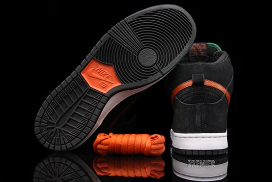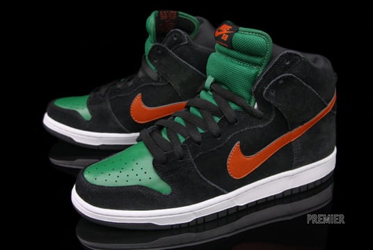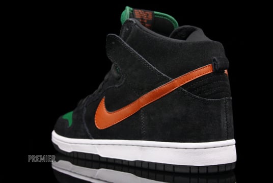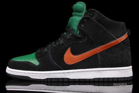With alcohol inspired past releases like the Nike SB Dunk Low ‘Heineken’, it’s only a matter of time until something like this springs back up. The Nike SB Dunk High ‘Jagermeister’ features a dominant black suede ย upper, green toe box and tongue and orange accents and Swoosh.