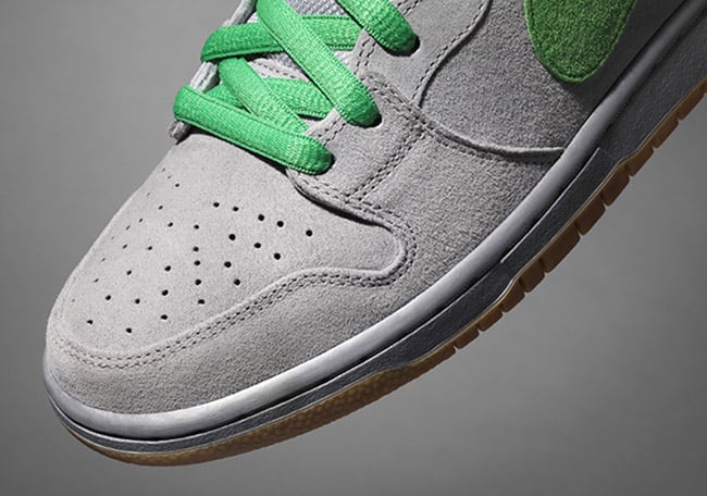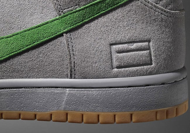 This Nike SB Dunk High has a similar look to the โIronsโ that released back in 2003, however the shade of Grey used is a bit lighter while the contrasting colors are now Green.