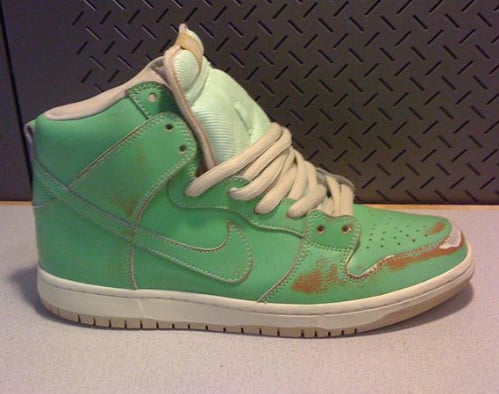 Newย Yorkย City’sย iconic symbol of freedom, the Statue of Liberty, is being made into a pair of Nike SB Dunk highs. First seen last week, the ‘Statue of Liberty’ Dunk features a sea green leather upper, with a cream like colorย midsole, and laces. One cool detail isย when this shoe gets scuffed the leather will fade into a bronze and silver under-layer.ย The crown of the Statue of Libertyย can beย found on the shoes tongue tag, another nice detail.ย The ‘Statue of Liberty’ Dunk will be available at selectย Nike SB retailers next month, check after the jump for a better look at this up coming SB Dunk.