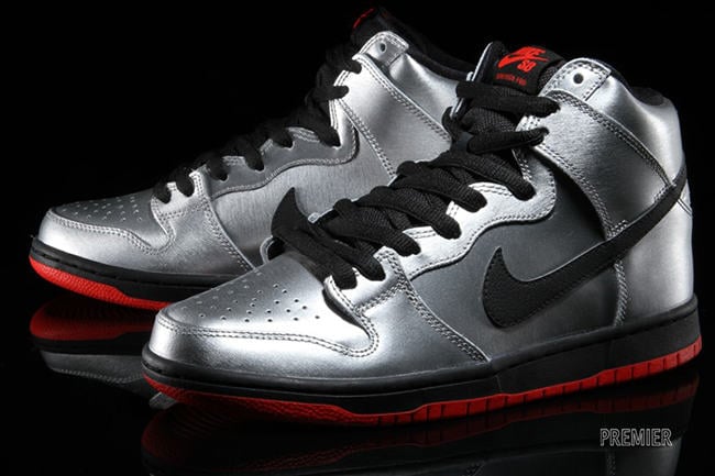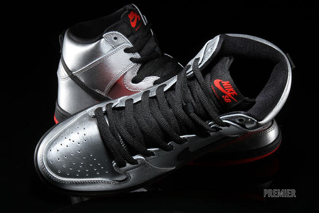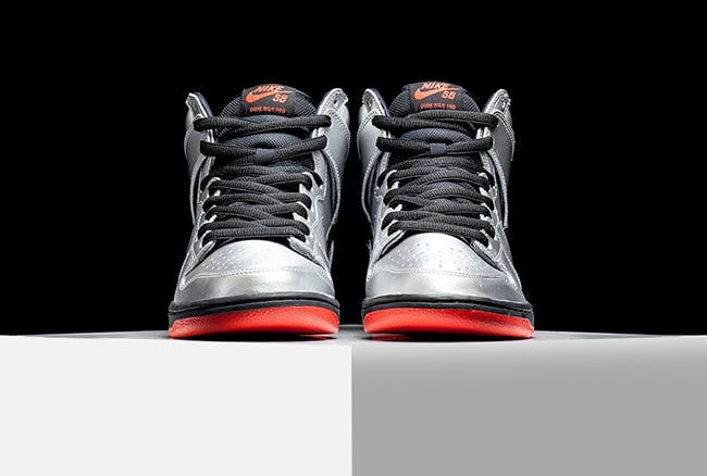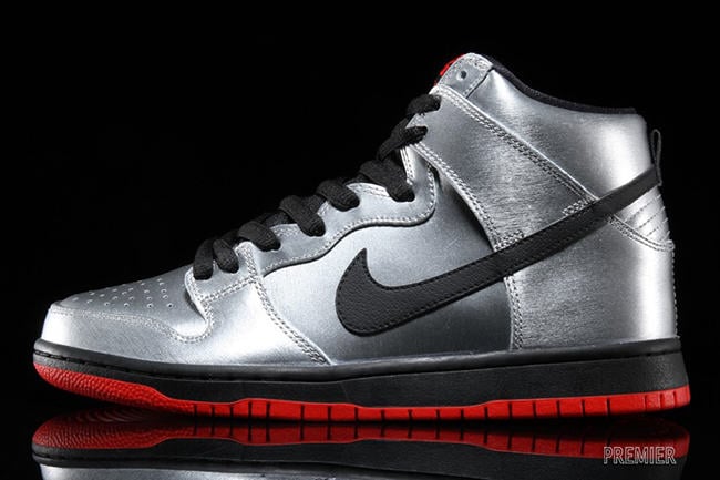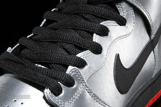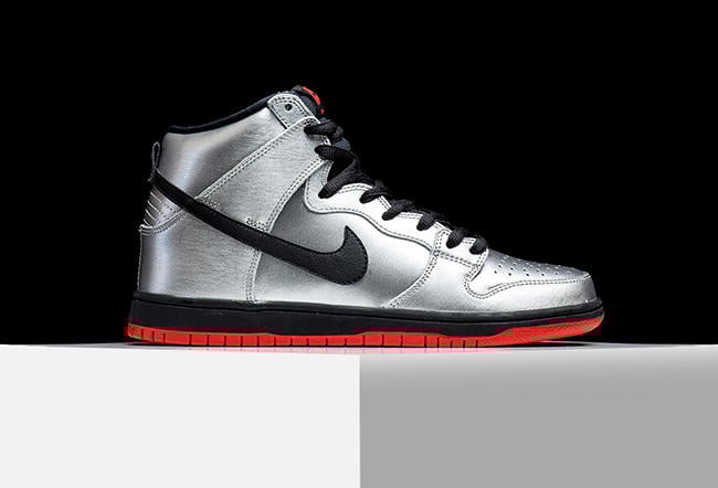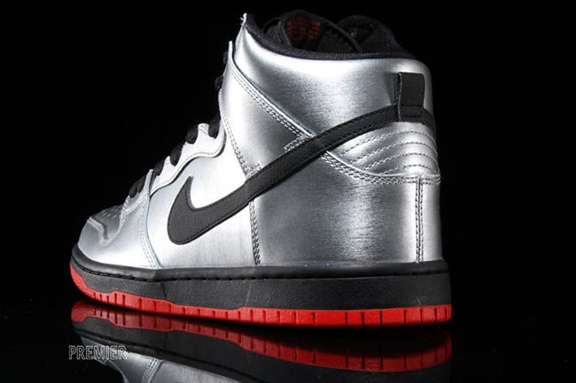 However you won’t see any branding from the company on this Dunk SB High, but the color theme does the representing. Using metallic silver leather through the base that represents the can while red accents hit the outsole and Nike SB on the tongue for ‘211’. Finally black comes into play landing on the tongue, laces and midsole for the actual Steel Reserve brand name.