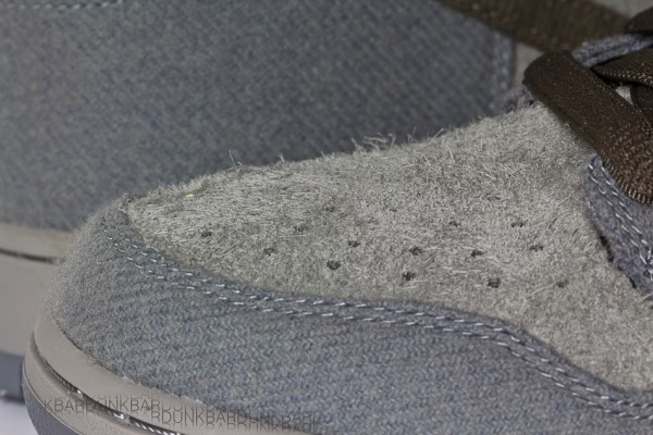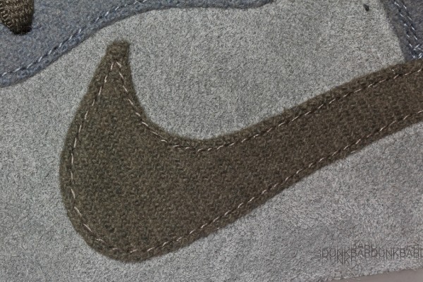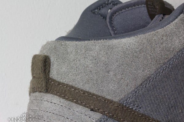 The shoe features a heavily texturized upper with grey suede and light blue canvas paneling alongside a dark grey canvas Swoosh. ย The shoe is finished off with dark grey laces, a grey midsole, and a light blue outsole.