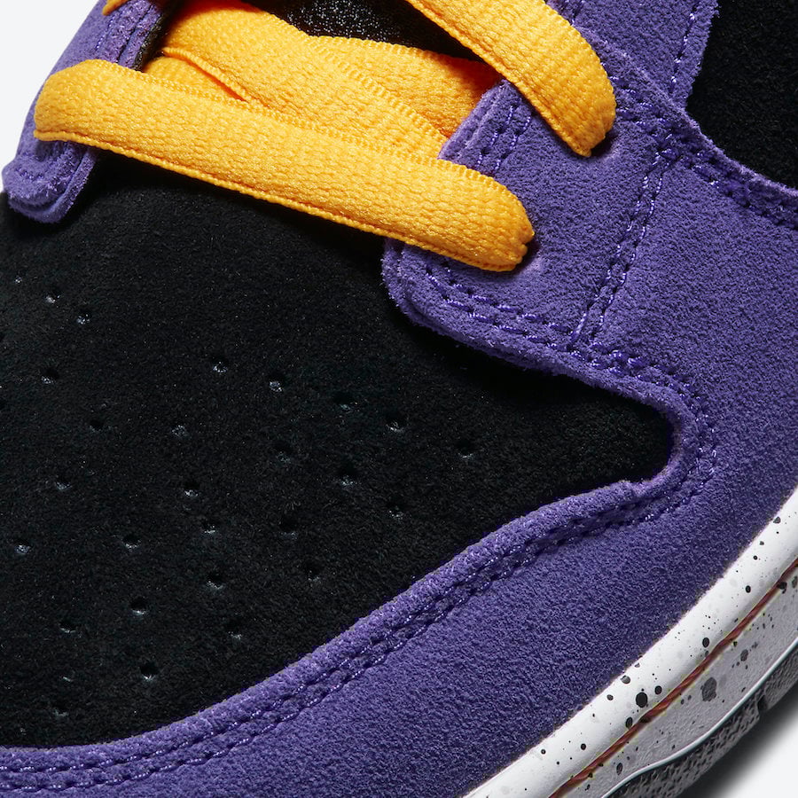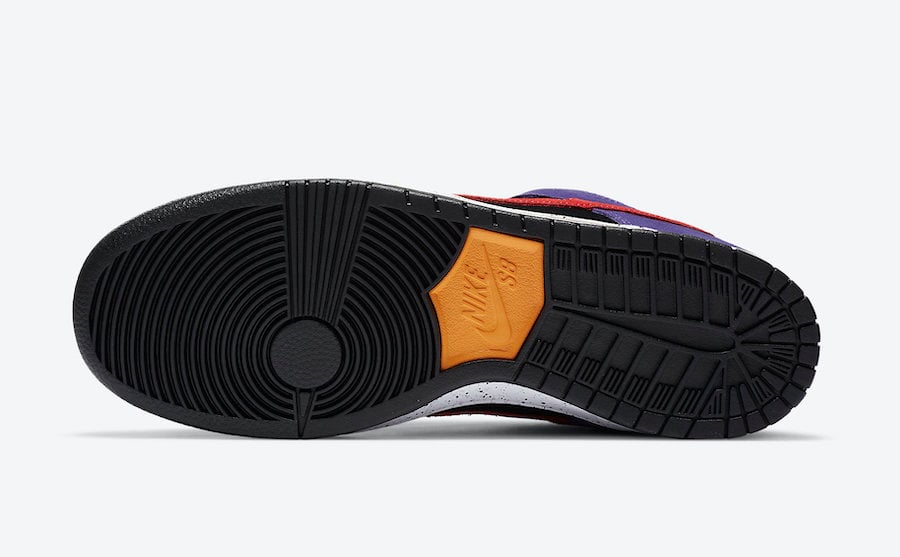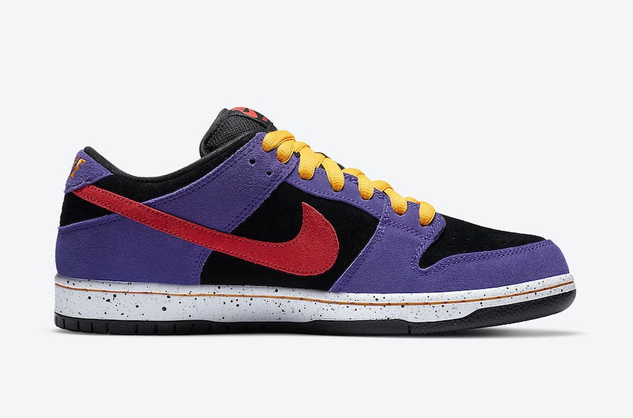 Looking closer this Nike SB Dunk Low comes highlighted with Purple overlays while Black lands on the base. Orange is then applied to the Swoosh which runs across the panels and Golden Yellow lands on the Swoosh and Nike branding on the heel. Other highlights includes a White speckled midsole while Black covers the rubber outsole.