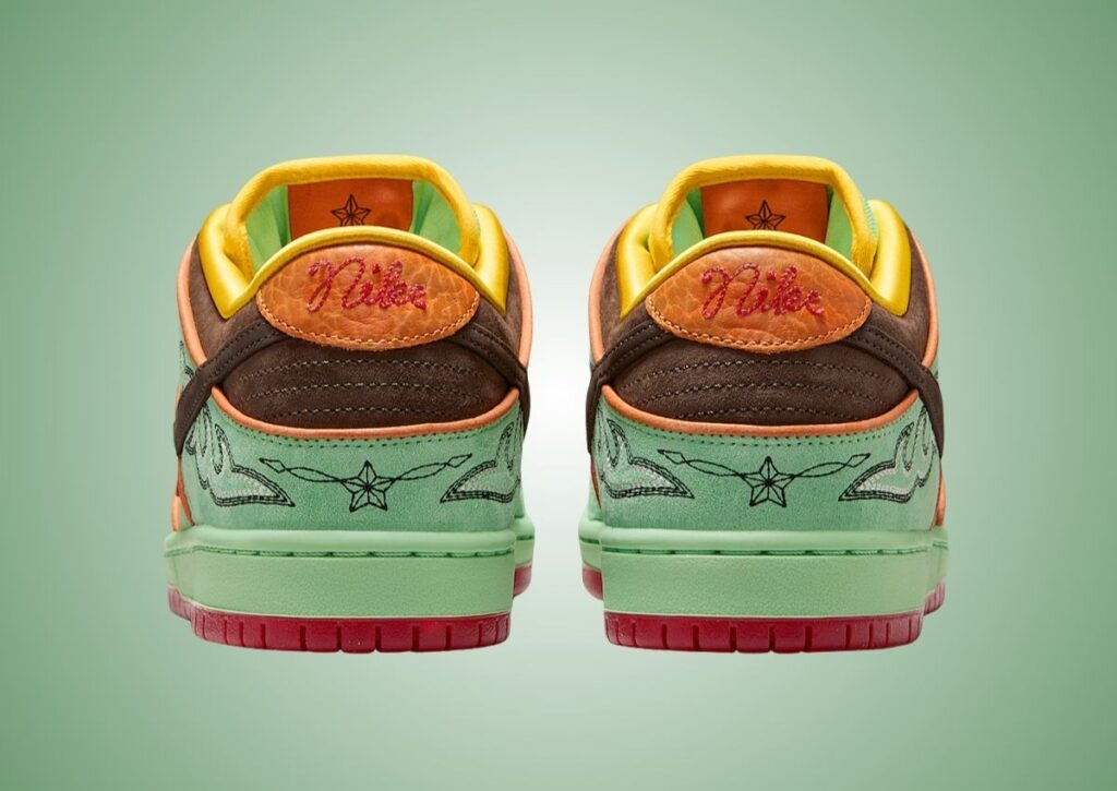 This Nike SB Dunk Low is dressed in a Tourmaline, Baroque Brown, and Monarch color scheme. Highlighted with Green across the suede upper. The pair also comes with unique designs on the lateral side, and rope laces that are inspired by lassoed rope, which the Nike branding on the heel features the same theme. In addition, Baroque Brown adorns the ankle with a Yellow hue outlining the pipping on the collar, liner, and tongues. Monarch (Orange) outlines the Swooshes, outlines the overlays, and covers the heel with Nike cursive. The insoles come with a design with a man riding a horse and a bull in the background. Other details include Green on the midsole, a Red rubber outsole, and a star on the heel.