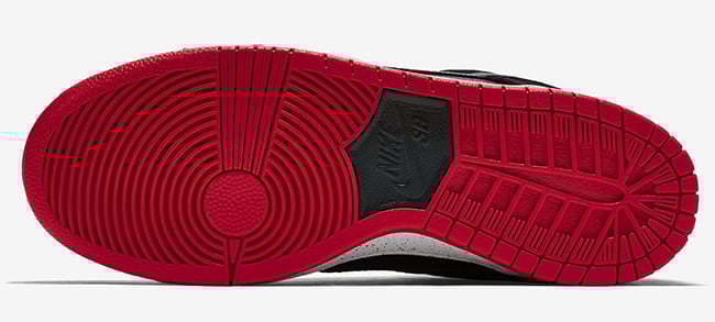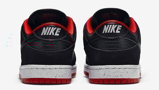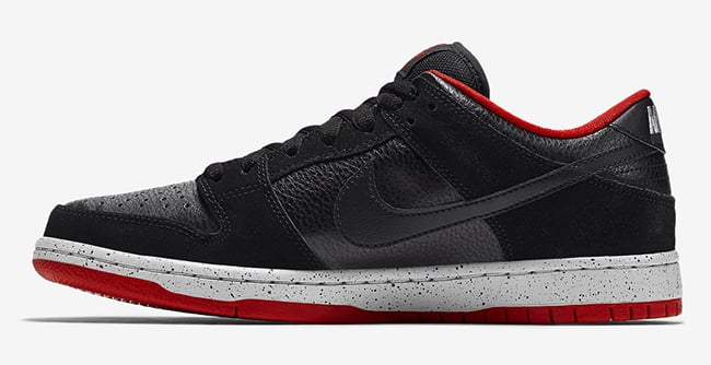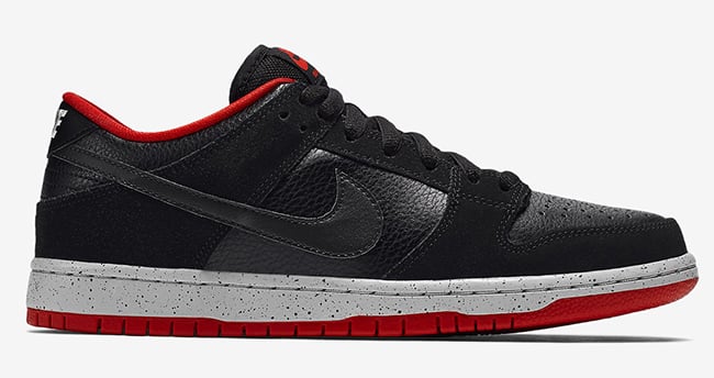 Nike SB borrows one of the well know Jordan 4 color schemes and applies it accordingly. Through the uppers is black leather and nubuck material. University red is the used on the liner and through the outsole and sole while wolf grey lands on the midsole. In addition, the midsole has a speckled overlay making them look even more like the black and cements.