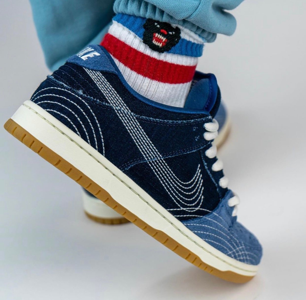 Looking closer this Nike SB Dunk Low combines both dark and light Blue denim throughout the upper while what sticks out is White stitching. Even the Swoosh is stitched for a unique look. Following we have Black used on the laces, White on the midsole and a Gum rubber outsole which finishes the look.