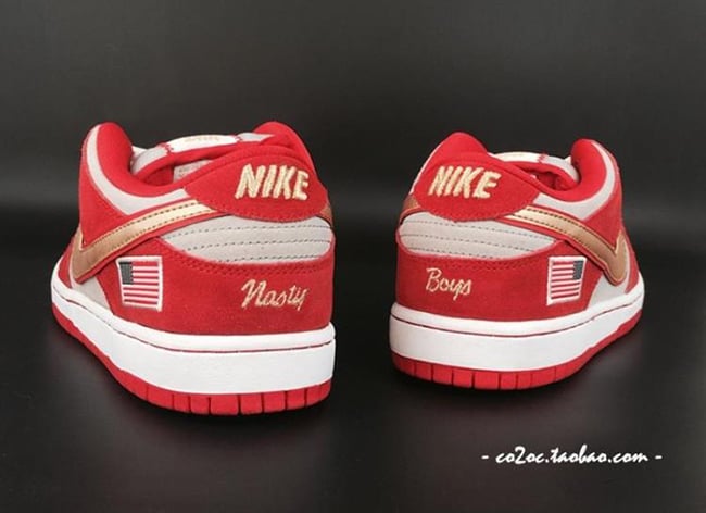 Featuring red nubuck through the overlays and outsole that is followed up with grey panels, tongue and toe box. Gold accents fill in the leather swoosh, Nasty Boys on the heel as well as the Nike branding. Other details include a white midsole, laces, a red cross stitch resembling baseball seams on the tongue and the American Flag by the heel.