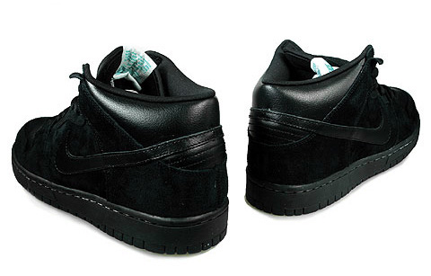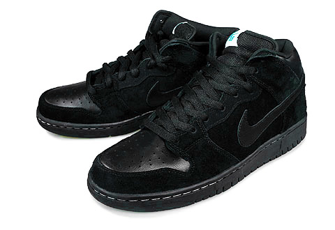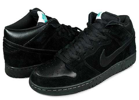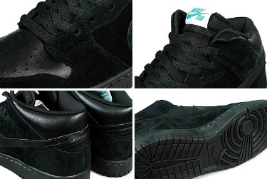 Last month Nike SB released their first strapless Dunk Mid, this month they continue their strapless mid series with the Nike SB Dunk Mid- Black/Aquamarine. The entire upper is dressed in black, with black suede on every panel but the toe box, ankle collar and Swoosh, even the mid and bottom sole is black. The only splashes of accent color that can be found is the white stitching on the midsole, and the aquamarine Nike SB lettering on the tongue tag. Expect these to drop sometime in the fall season. More pics after the jump.