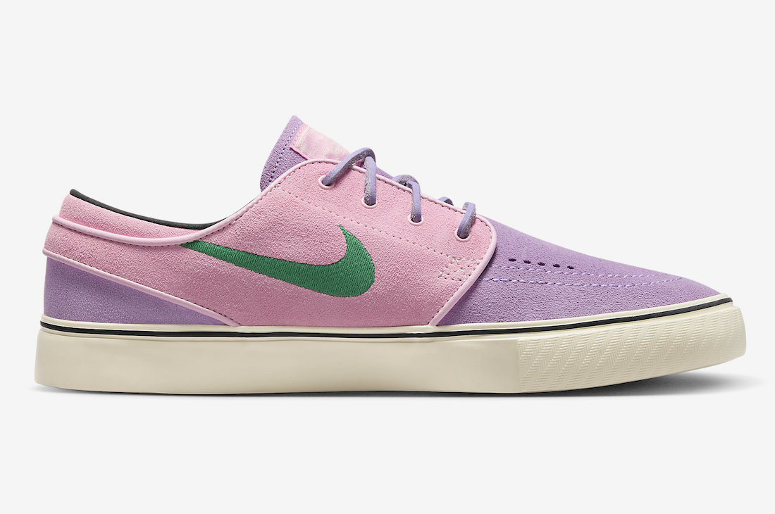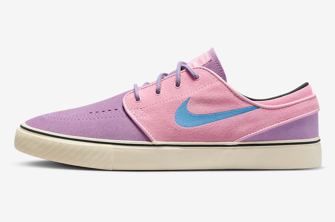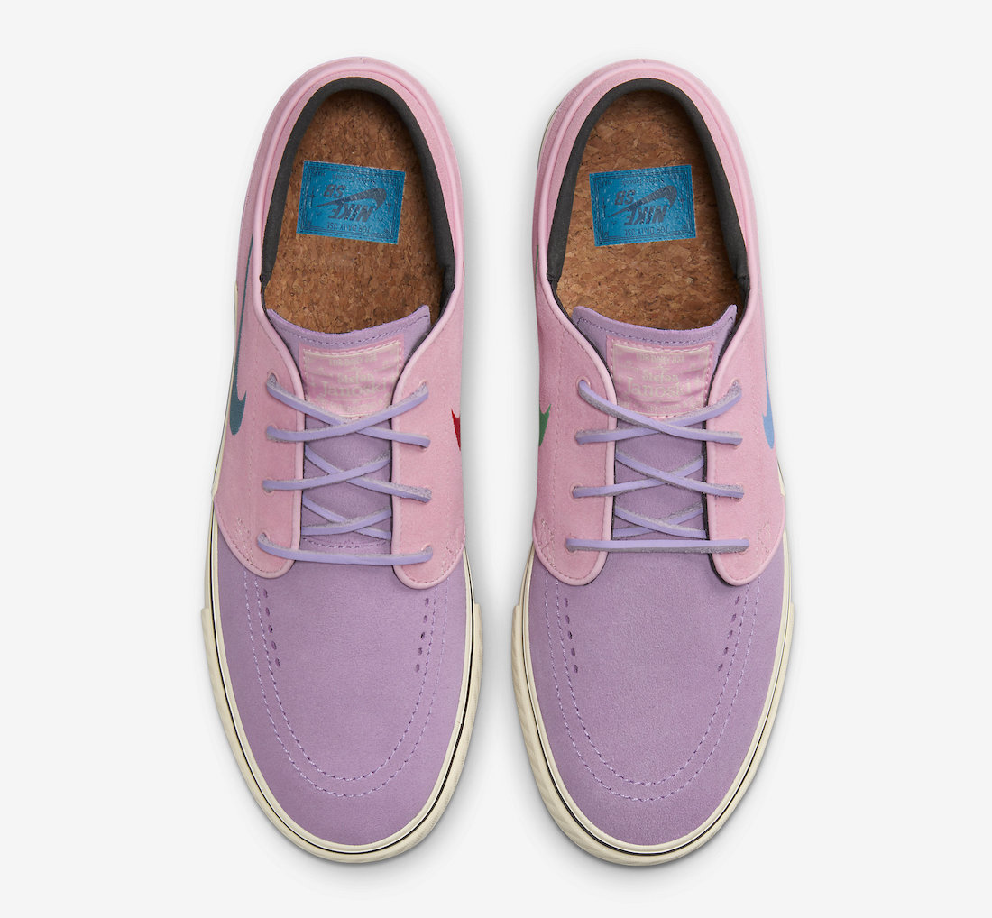 This Nike SB Stefan Janoski sports a Lilac, Noise Aqua, Medium Soft Pink, Coconut Milk, Blue Lightning, and Black color combination. Constructed with suede throughout and perforations on the toe box for added breathability. Next, we have mismatched embroidered Swoosh logos across the panels, boasting Blue, Green, Red, and Teal, waxed laces, and cork insoles. Other details include the traditional branding on the tongues, and Coconut Milk on the vulcanized rubber sole.