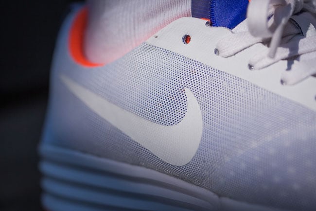 Using White, Racer Blue and Total Crimson color scheme which is a nice look for the Spring. Racer Blue and Orange mix things up on the tongue while Orange again is used on the liner and hinted on the outsole. An Off-White lands on the Swoosh while a soft Grey hits the midsole.