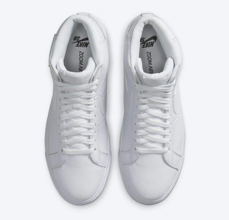 Looking closer this Nike SB Blazer Mid comes dressed in all-White while constructed with leather across the upper. In addition the same shade covers the branding and they also come equipped with Zoom Air cushioning. Completing the look is a bit of Black which lands on the insole branding.