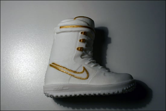 As apart of a promotion effort, Nike hopes to launch their Air Force 1 looking Snowboard boot for the Fall & Winter season through miniature replica boots. The toy boots were scaled down and given to promote the line, however they do look real and reveal a possible collaboration with Stash, as indicated by one of the toy boots that features his spray paint top all over print. Stay posted for more info. Via C to the JL.