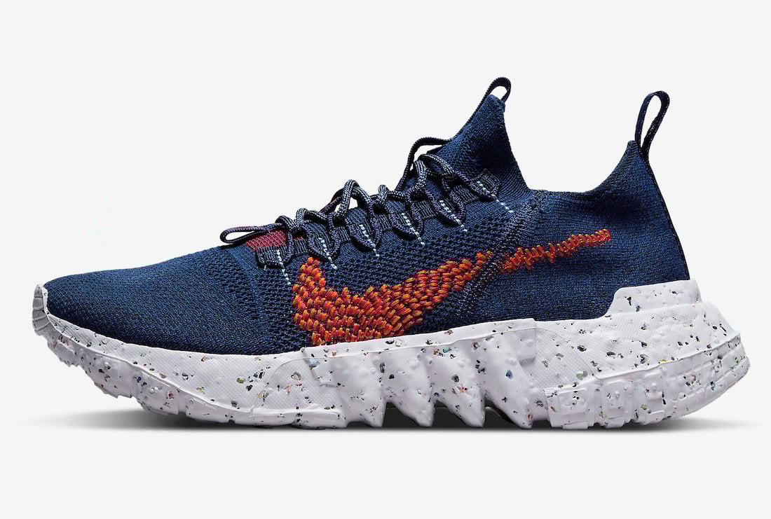 From the upper to the outsole, Space Hippie 01 is made of at least 50% recycled material by weight. Its โSpace Waste Yarnโ upper includes about 90% recycled polyester made from recycled plastic bottles, t-shirts, and yarn scraps. Other details include Orange and Red on the Swoosh logo, and a speckled midsole and rubber outsole.