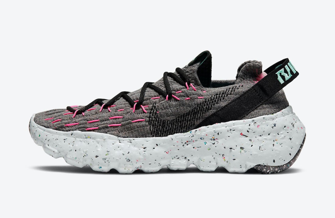 Highlighted in a Smoke Grey, Black and Pink Blast color combination. Constructed with 25% recycled material by weight, this model is also the lightest to date from the collection and has the lowest carbon footprint. Utilizing both Grey and Teal Space Waste Yarn on the upper which is constructed with recycled bottles, t-shirts and yarn scraps. Following we have Pink detailing along with a Crater Foam midsole which finishes the look.