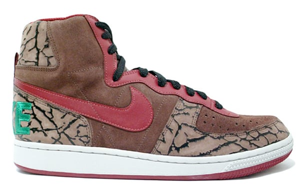 Elephant print has been taken to a new level these past few weeks with the likes of Ultimate Glory Dunk High and other elephant print based sneakers. The Nike Terminator High Premium is the latest to get the cement print treatment being paired with brown, green and red. This classic basketball sneaker also gets a few key additions including a combination of suede and leather. The brown elephant print Terminator High Premium and matching low top can be found now at atmos.