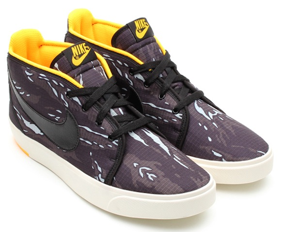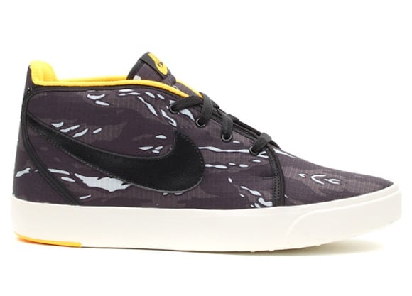 When you thought the month of “Camo” color-ways was finished, Nike brings out another “Camo” colorway for the Nike Toki Mid. Suited up in an all black tiger camo on the nylon upper; black was accented very nicely along the swoosh, laces, and heel. The bright yellow coloring along the inner and logos really make this pair of Nike Toki Mid stand out.