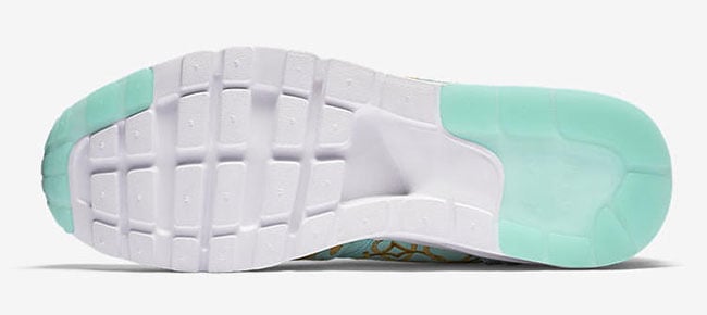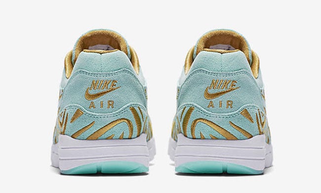 The Ultra edition of the Nike Air Max 1 shown features an eye-catching teal through the base with suede materials. Following is Gold used through the unique design seen through the mudguard, uppers and branding. Completing the look is a White midsole and Paris abbreviated on the lace jewel.