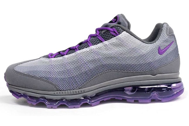 Donning a grey suede and mesh upper with purple accents, these kicks come complete with an extensive Dynamic Flywire system at its side panels, a full bottom Air Max Unit, purple laces, and matching branding at the back heel and tongue.