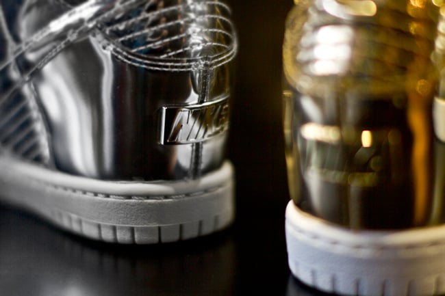 As we’ve seen several metal-inspired sneakers in the past like the recently released Nike WMNS Air Max 1 “Liquid Silver” and “Liquid Gold“, Nike Sportswear delivers more precious metals with the arrival of the Nike WMNS Dunk Sky Hi “Liquid Metal” Pack today.