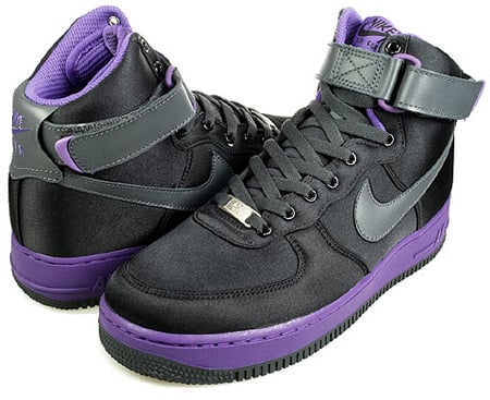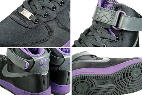 Nike’s Air Force 1 High looks promising for the end of this year and next year as we see a variety of color schemes and designs, here’s a look at the latest Woman’s version. This model features a black satin upper with purple contrasting on the tongue, midsole and inner ling. Anthracite is another color that is found on this high-top and appears on the swoosh, laces and ankle strap. You can find this Air Force 1 High early on LTD-Online and will hit retail stores on November 29th.