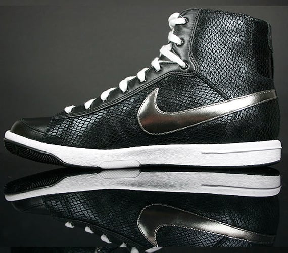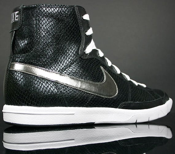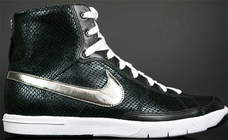 With the launch of the Nike’s Skinny series of the Dunk High, women have a new option for sneakers, but fans of the Blazer Mid can turn to this unique looking make-up. This Blazer Mid is composed of smooth black leather overlaid with a snakeskin pattern and a metallic silver swoosh. The midsole is kept clean with white along with the laces. Inside the sneakers is dark grey lining with the Nike logo stitched in the same color. You can expect to find this womens Blazer Mid now available at Nike retailers.