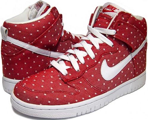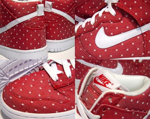 A week before Christmas we brought you a look at two pairs of the Nike Dynasty high slated to release in commemoration of the Valentine’s Day holiday in 2010. Now pictures have surfaced of a Nike Dunk high designed for the women and also scheduled to be a part of the Valentine’s Day celebration. This shoe comes with a predominantly red canvas upper, white boxes that run throughout it, a white Nike swoosh, white shoe laces, and a white sole. Does this simple, traditional Valentine’s Day colorway appeal to you after being applied to the Nike Dunk high silhouette? Although one could only expect these to release from select Nike retailers in time to be actually worn on Valentine’s Day 2010, keep checking-in with us as more concrete release/availability information surfaces.