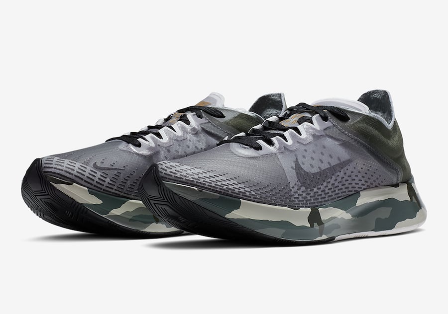 As you can see this Nike Zoom Fly features shades of Dark Green and Olive across the upper along with a semi translucent TPE upper. Hints of White is also seen while camouflage detailing runs across the midsole and Black lands on the outsole.