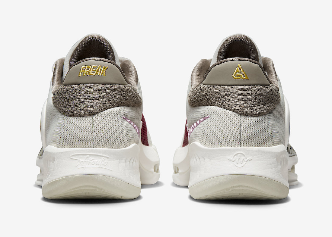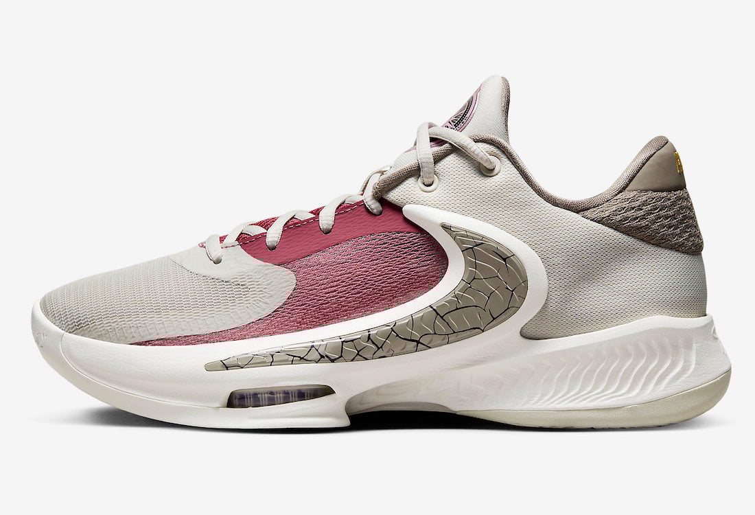 This Nike Zoom Freak 4 features a Light Bone, Moon Fossil, Sail, and Sweet Beet color combination. Constructed with leather, mesh, and synthetic materials, one of the highlights of this pair is the cracked lateral Swoosh that represents the ancient walls of the Colosseum. Other details include a Sail midsole, matching rubber outsole, and a visible Zoom Air pod on the forefoot.