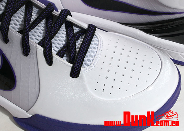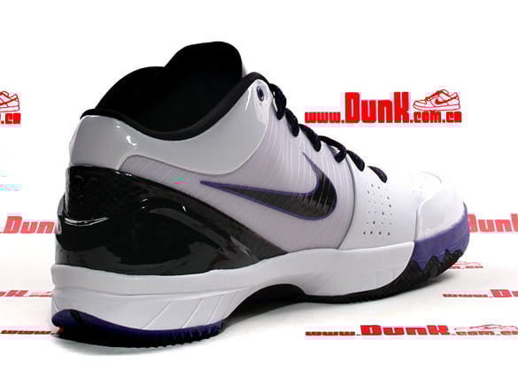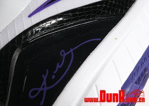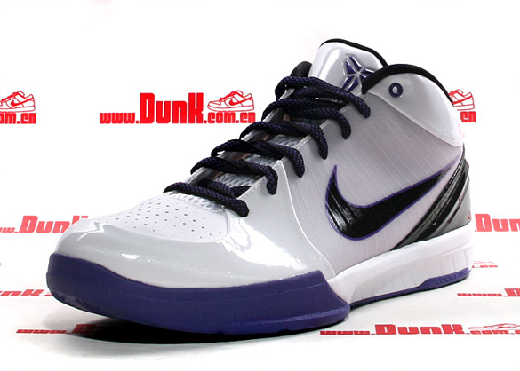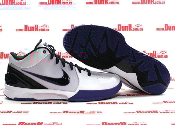 One of the big names in 2009 is the Nike Zoom Kobe IV (4) which has taken on different appearances and concepts. This model is one of the first to be previewed and will be coming out inย February. Featured is a combination of white, black and varsity purple perfect for when the Los Angeles Lakers play in their alternative white jerseys. The sneakers consist of white patent leather along with a hint of black and varsity purple. Lastly the Zoom Kobe IV X sports Kobe Bryant’s signature in purple on the back heel. Look for the sneakers when they drop next month. Via Dunk.com.cn.