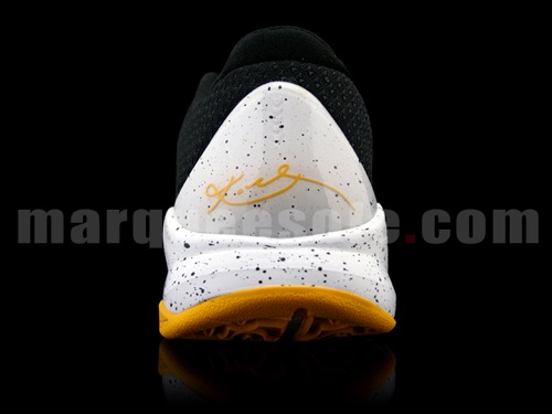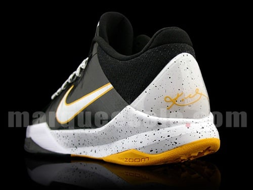 We all know Kobe Bryant is a fan of low-top basketball sneakers, which stems in part from his love for soccer. So it’s no surprise that the Black Mamba was also a supporter of the Nike Hyperdunk Low model, such as the “Snake Pool” pair he endorsed. Now, we have another Nike Zoom Kobe V to show you, which, like the “Snake Pool” Nike Hyperdunk Low sports “del sol” coloring- but only minimally. Pictured here is the black/del sol-white Nike Zoom Kobe V that comes with a predominantly black upper, with slight white and “del sol” yellow accents. Moreover, the sole comes with black speckles, while the white shoe laces also have black dots. Check out more pictures of this Kobe V after the jump, and let us know what you think of this colorway.