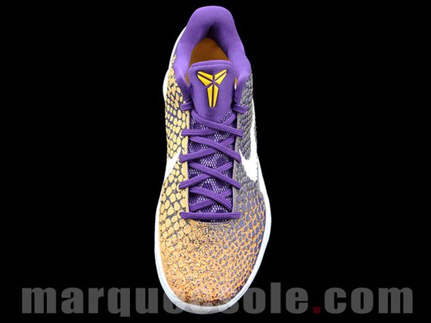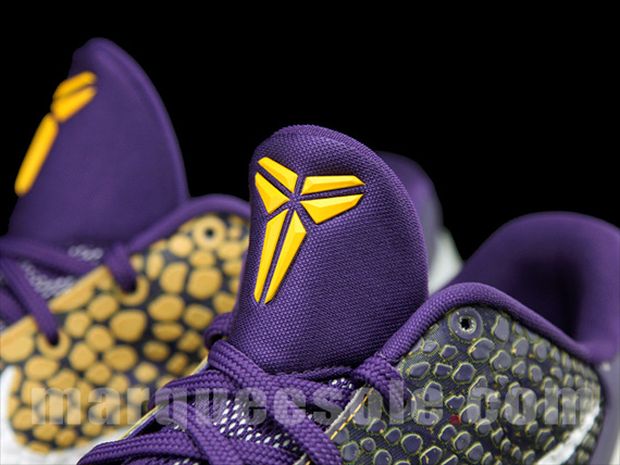 This Kobe also features purple heel panels, lacing and inner sock liner. The white midsole, Swoosh and heel support accent the shoe as well as a yellow Sheath.