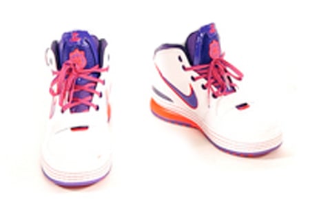 Yesterday, we spotted a Nike Zoom Solider III PE on Sue Bird’s feet, and today we have our first look at a Nike Zoom LeBron 6 (VI) made exclusively for Diana Taurasi of the Phoenix Mercury. This pair features a white leather upper with orange and purple accents. Though the sneakers do not match with the Phoenix Mercury jerseys too well, it is still pretty interesting too see WNBA athletes with heat on their feet. There is nearly no chance for these Player Exclsuives to ever hit retailers, so be sure to check out the additional pictures after the ‘jump.’