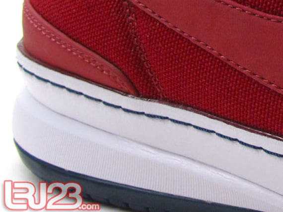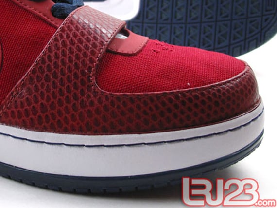 The last Nike Zoom LeBron VI (6) Low that we saw was a simple colorway; this time around, Nike has given the Cleveland Cav’s captain’ s sig shoe some flavor with the Nike Zoom LeBron VI Low sample in varsity crimson/white/midnight navy. The shoe features a varsity crimson red upper and toebox made of woven material and a nubuck swoosh that matches the back heel panel, ankle panel, and shoelace area. The upper is contrasted by a red snakeskin toe area, navy laces, white midsole, and navy sole. And of course the low’s use single stitching in the midsole. So if you’re a fan of these ZLVI’s, then pray that these get released.