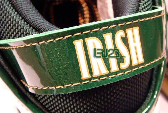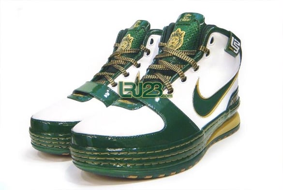 Pictures of theย Nike Zoom Lebron VI (6) – Saint Vincent Saint Mary Awayย first surfaced from an online auction at the end of last month.ย The home ZLVI is made up of green patent leather, white and hints of gold around the swoosh, stitching, midsole, sole and on the laces. Lastly, “IRISH” appears on the heel tab in reference to SVSM team name. This Zoom Lebron VI will release at theย House of Hoops and Nike Asia basketball stores. Via LRJ23.