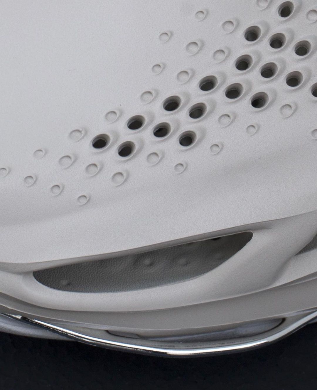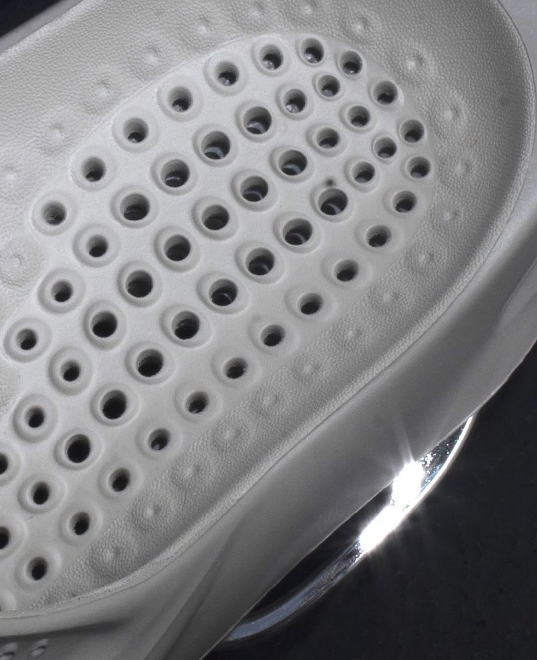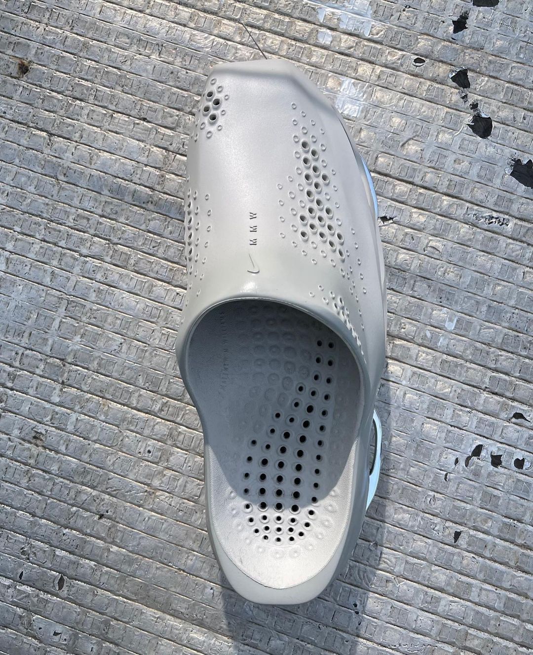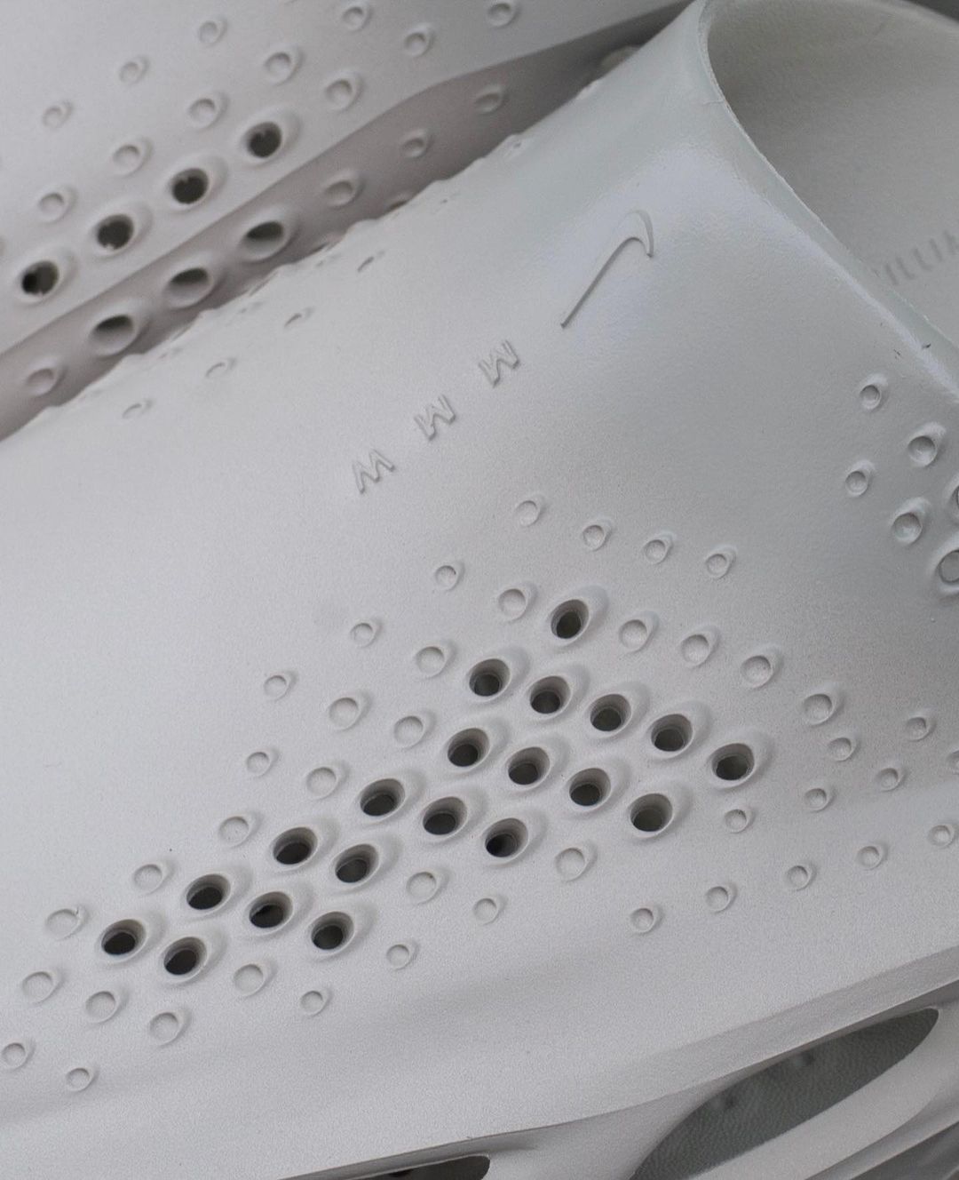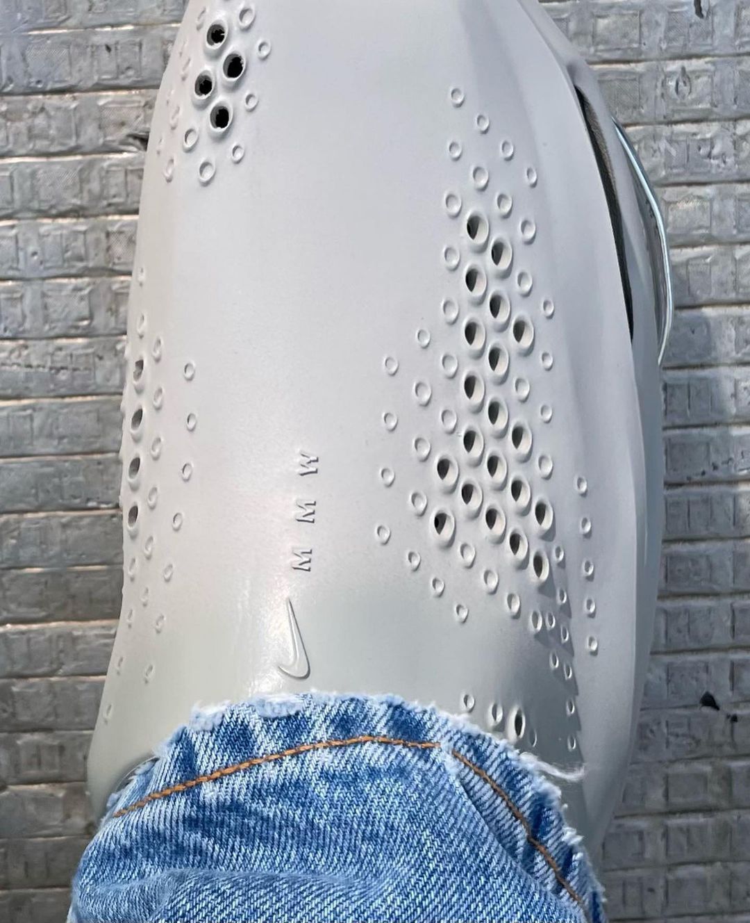The Nike Zoom MMW 5 features a foam build with various sized perforations on the upper and larger cutouts on the mudguard. As you can see, this pair comes covered in Grey while the MMW x Nike logo lands on the upper, traditionally where the tongue would be. Other details include Chrome accents and a two-tone White and Beige sole.