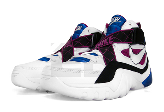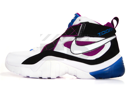 After seeing the Nike Zoom Sharkalaid being influenced by movies such as Transformers 2 and G.I. Joes, it’s nice to see that the basketball shoe has been released in a simple general release colorway. This time, the Nike Zoom Sharkalaid comes in a white/white-black-varsity royal colorway, using a white leather upper with black nubuck panels. The white swoosh is outlined in black to match the white and black colorway, but varsity royal and purple are added to contrast the shoe nicely. The tongue is made of silky varsity royal material to give add some class to this $88 shoe, which is available now.